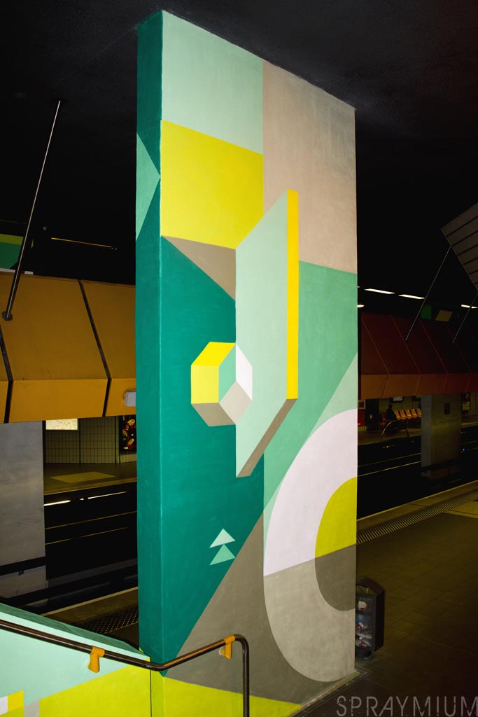 Pour cette station de métro, l’architecte en charge de la restauration a donc eu la bonne idée de faire appel à Nelio pour repeindre plusieurs de ses murs. Après avoir soumis quelques idées sous forme de croquis préparatoires, ce dernier eut le champ libre sur l’ensemble du projet. L’idée principale était simplement d’apporter des éléments lumineux et colorés afin de mettre un peu de vie dans un lieu souterrain habituellement sombre et fade. Si l’ensemble de l’oeuvre est très abstrait, on y retrouve néanmoins quelques lettrages symbolisant la relation entre le métro et le graffiti. Avec son travail géométrique, il ne lui fut pas difficile de s’adapter à l’architecture de la station, s’appuyant sur quelques lignes directrices comme par exemple la longue descente de l’escalier.